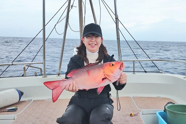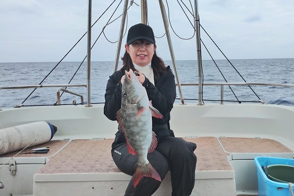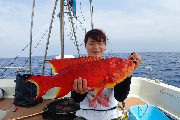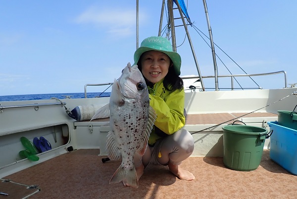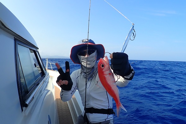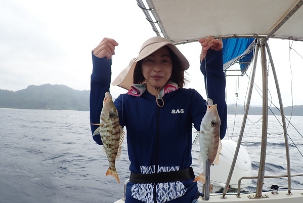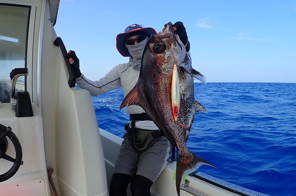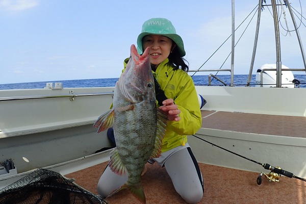 | 長かった時化もようやくおさまり、今日だけは出船出来ます!そんなラッキーな日に遊びに来てくれたのは、リピーターの女性アングラー。 西表島らしい大物を狙って、水深70〜90mでタイラバをしてきました。 潮の流れがしっかり有り、ベイト反応も良好!開始1時間も経たずに、良型サザナミダイをキャッチ!!その後も、 魚探の反応に付いている良い魚達が次々に釣れました。しかし時合は長く続かず、その後はムルーやナガジューを数匹釣り上げて帰港となりました。短時間ながらもアタリが多く、美味しい食材調達ができました。 |