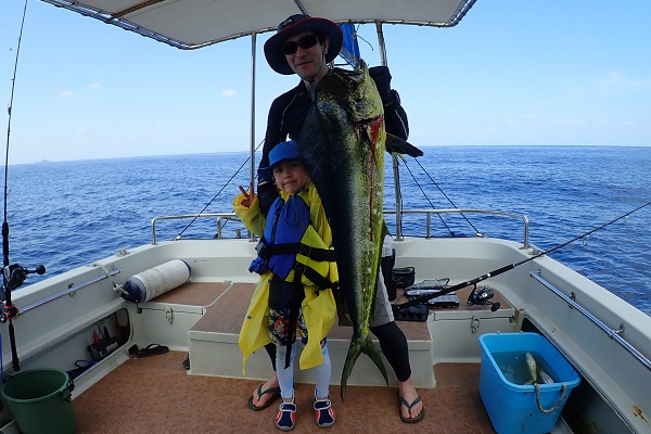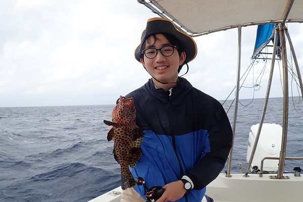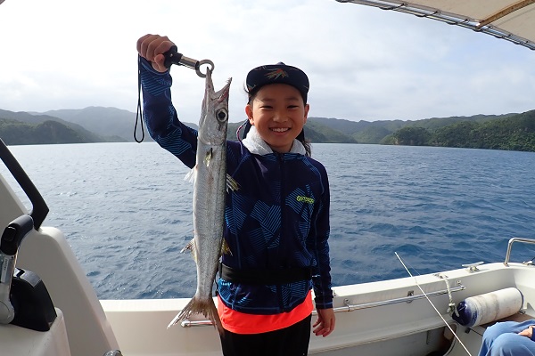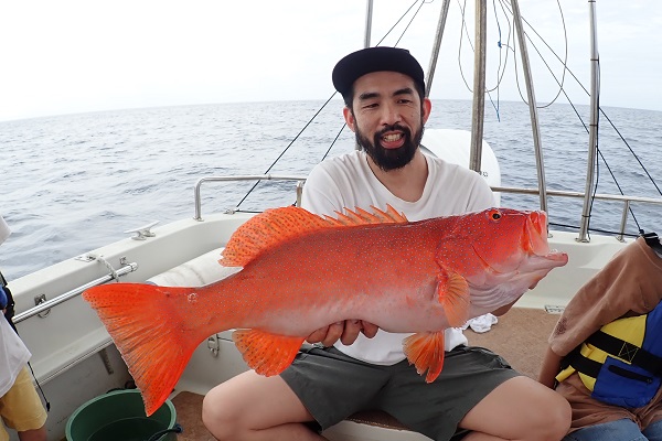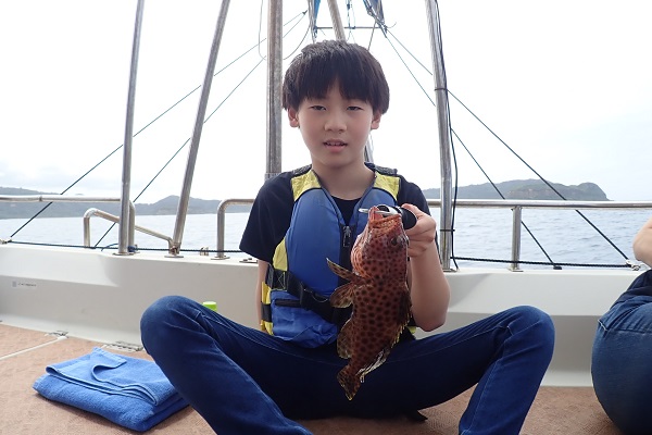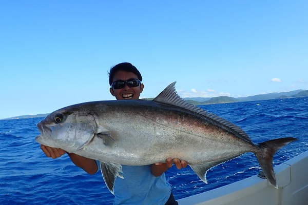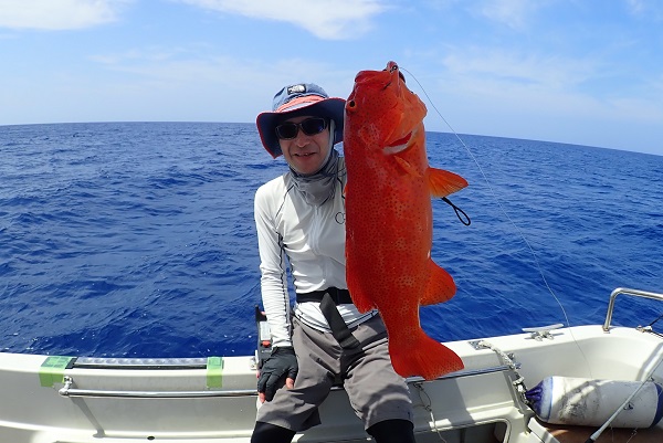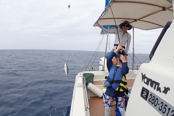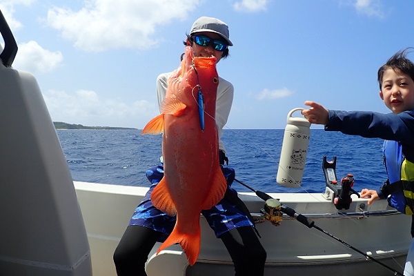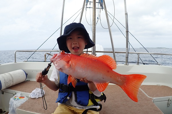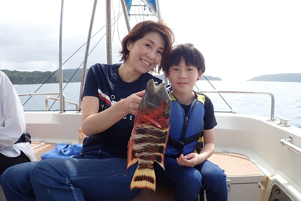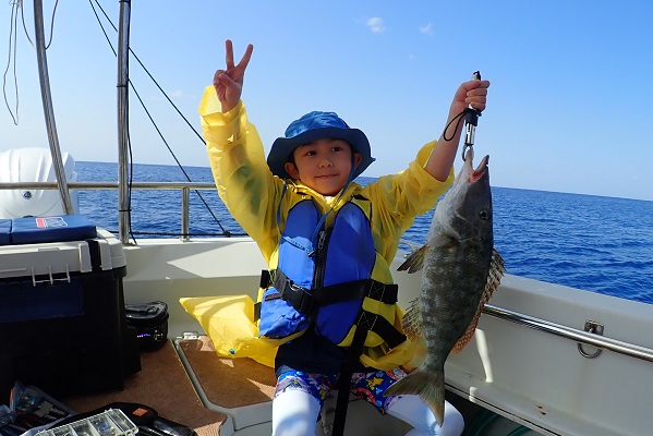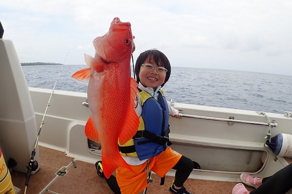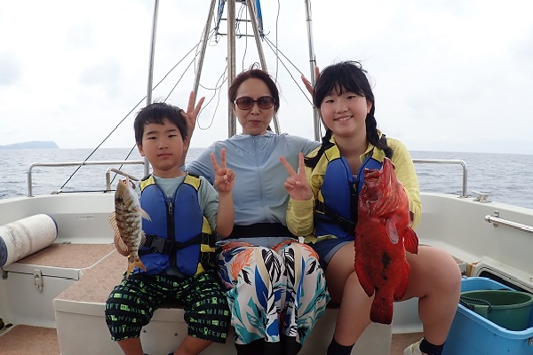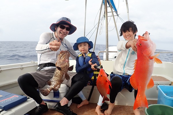 | 今日は波1mの凪予報。風も波もなく、これこそ海日和です! 前日に問い合わせを頂いた、釣り好きご家族と体験フィッシングへ行って来ました。 開始直後、お姉ちゃんに良いアタリがあり、釣れたのは良いサイズのオジサンです。食べても美味しい魚ですよ!その後もアタリが多い日で、 巨大なアザハタを始め、フエフキダイはみんなでたくさん釣れました。 天候・潮にも恵まれた体験フィッシングとなりました。 |