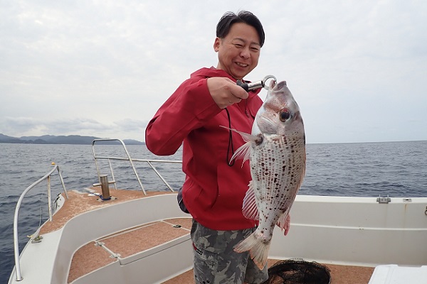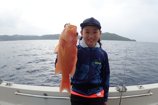 | 午後は雨予報でしたが時々晴れ間も見え、波も午前より穏やかになっていました。午後も餌釣り・泳がせ釣りで美味しいお魚を狙って行きます。 午後も早々にアカジンを、これまた弟くんが見事キャッチ!まだ6歳というのに一人で頑張ってる姿に感動です。お母さん、お兄ちゃんも良い魚を釣り、残るはお父さん!問い合わせの時から大物を釣りたいとの事でしたので、釣れたてオジサンを餌に泳がせ釣り開始!の、1投目で、 ここ最近不調だった泳がせ釣りでアカジンを釣り上げていただきました。着底直後10秒でのアタリ!船長としても気持ちの良い1尾でした。 午前・午後共に釣れた高級魚たちは「一隼」で調理をしてもらい、美味しい夕食になります。アカジンをこんなに堪能でいるのは釣り人の特権ですよ!! |