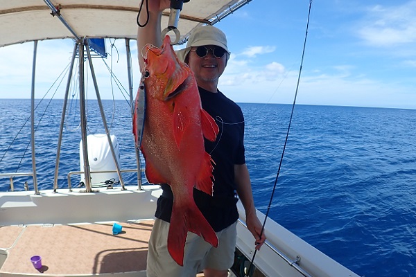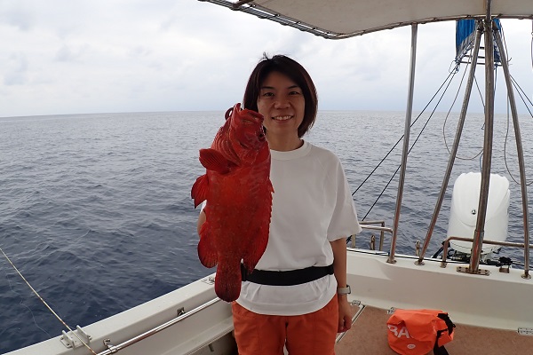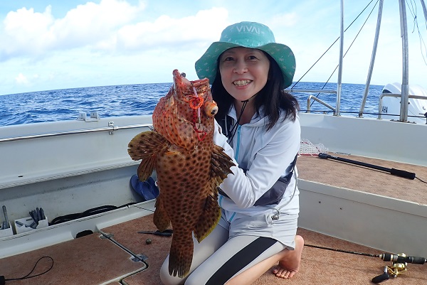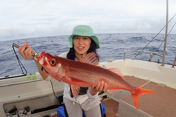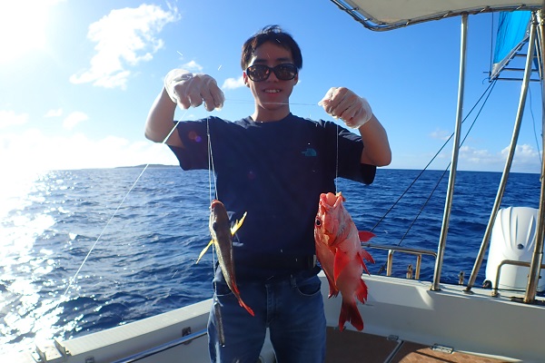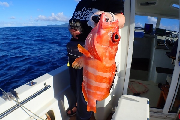 | 年に数回遊びに来て頂いている常連様。毎度釣れた魚を食べるところまで楽しんでいる為、今回は深海釣りで美味しい魚を狙ってきました。 竿・電動リールを買い、気合い十分で行って来ました。 今回も早朝出船で深海釣りへ。しかし思ったより波があり、とても釣りにくい状況でした。ファーストフィッシュは深海ビタロー、次に引きが強い魚が掛かりましたが、本命アカマチではなくハチビキでした〜。 その後は更に深いポイントへ移動して、 500mの常連エチオピア。本命はナンヨウキンメだっただけに少し残念。 次回は本命キャッチしましょうね!! |