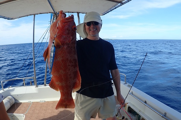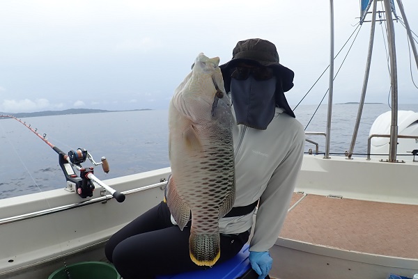 | 今日も朝から雷&雨の西表島です。出船をするか悩みましたが、出てみれば全く雨は降らず、曇り空でうみ日和でした。今日はグルクン釣り、泳がせ釣りです。 餌となるグルクンを釣っている最中、グルクンが何者かにかじられて上がってきたので、泳がせ釣りをしてみれば立派なマダラハタでした! その後もアタリ連発で、 アンカーを掛けながらの泳がせ釣りで、アカジンもキャッチ!! グルクンが集まったので、沖へ出て泳がせ釣り開始。サメのバイトもありましたが、アカジンをもう1尾追加。さすがの腕前でした! |
