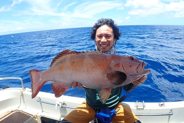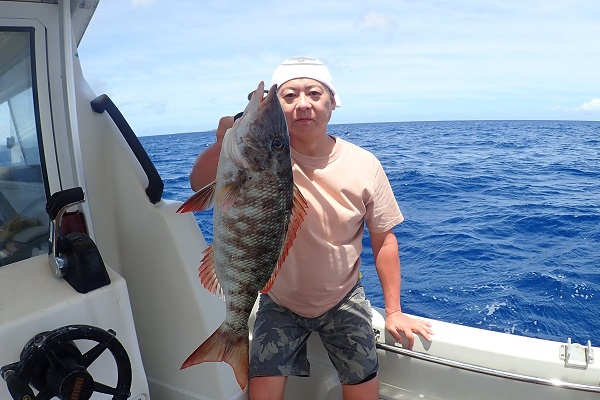 | 昨日に引き続き常連さんと、今日はグルクン泳がせ釣りでコクハンアラを狙ってきました。去年が活性低く撃沈しただけに今年こそしっかり釣ってもらいたいです。 コクハンアラのポイントを転々と回り、ようやく釣れたスジアラ!午前中が釣果ゼロなだけにとっても嬉しい1尾でした。その後はサメの活性が良くなり、時々邪魔をされながらも、 見事コクハンアラを2連続キャッチ!そして1匹目よりもサイズアップ! 今年も潮の流れが緩く悩まされましたが、仕掛けの太さ・針の大きさ・餌の付け方など試行錯誤の末、無事にターゲットをキャッチできました。 楽しい2日間ありがとうございます。また、1年後にお待ちしております。 |