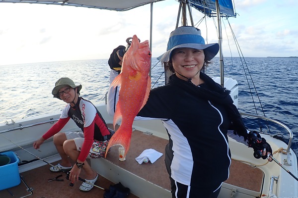 | 日中は他のツアーに参加していて忙しいリピーター様。でも、釣りがしたいとの事で、2日連続サンセットフィッシングへ行って来ました。 初日は良いサイズのアカハタやミミジャー等食べて美味しい魚が釣れましたが、徐々に魚の活性が悪くなり、最後の方はゆんたくタイム! そんな喋っている時に限って、でかい魚がバイト&ブレイク・・。この悔しさは、明日リベンジ! そして翌日は、 見事餌釣りでアオチビキをキャッチ!!その後もムルーは入れ食い、ミミジャーも時々混じりとっても良い潮です。最後にはシロブチハタまで釣れて大満足で2日目となりました。また来年もお待ちしております! |