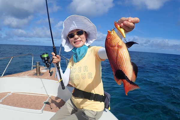 | 今日も緩めの南風、波はなし、海日和継続中です。そんは本日は午前中にエンジンのオイル交換を済ませ、午後から半日チャーターでライトジギングへ行って来ました。 夏特有の2枚潮が始まり、シーアンカーでは釣りにならず船を立ててのジギング。ミミジャーポイントでは、狙い通り見事ジャンボサイズをジグでキャッチ!その後は、 良型アズキハタ、アカジンと見事美味しい魚をキャッチ!アカジンは探し回って最後の最後に釣り上げた1尾。シャウトのショーテル、良い仕事してくれました。是非またお待ちしております!! |