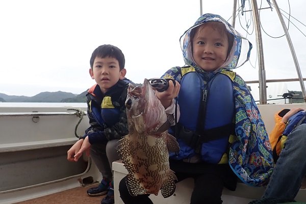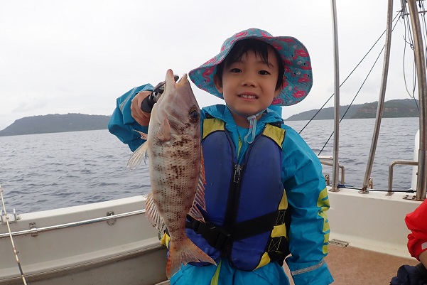 | 午後からもご家族と体験フィッシングへ。午前より波が高く、穏やかな場所まで移動して釣り開始。 波+雨で悪条件でしたが、ナミハタは良型を複数キャッチ! 寒い中、初めての船釣りお疲れ様でした。次回はもっと暖かい時期に遊びに来て下さいね。 |