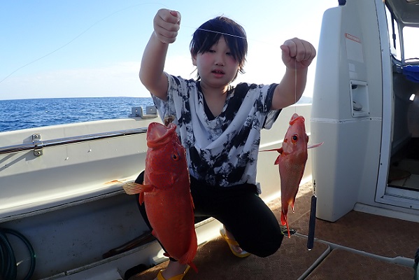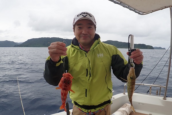 | 天気もしばらく安定して、気持ちの良い南風です。気温は26℃。 今日は午前ライトジギング・午後カンパチジギングと2本立てです。 初めてのライトジギングでアカジン狙いでしたが、簡単にアカジンを釣り上げていただきました。TGベイト100g最強です!! 次回はまた来年ですか!?またお待ちしております。 |