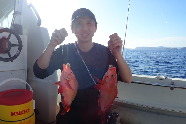 | 去年も2月頃遊びに来ていただいたリピーター様。今回は滞在期間が長く、出れそうなタイミングでお願いしますとの事で、出船出来ました! 前日まで波4mの大時化。朝はうねりが大きく残っていたので鹿川方面でハタ狙い。その後は深海釣りでアカマチ・ビタローと美味しい魚を狙ってきました。 ハタの活性は高く、午前中でアカジン・シロブチハタ・オオモンハタと良型がつれました。午後からはポイントを大きく変えて水深250mへ。 去年食べてからすっかりお気に入りの深海ビタロー。上品な白身で刺身・煮魚となにをしても美味しいです。狙い通りに食べたい魚が釣れた1日でした。 |