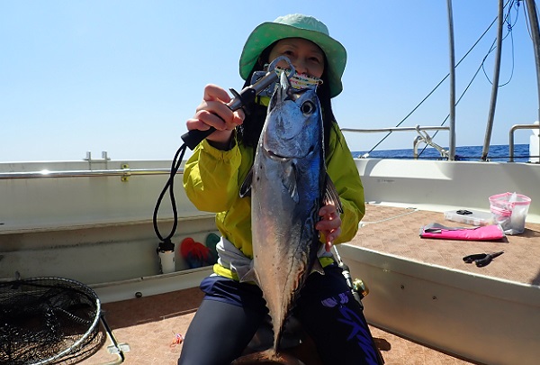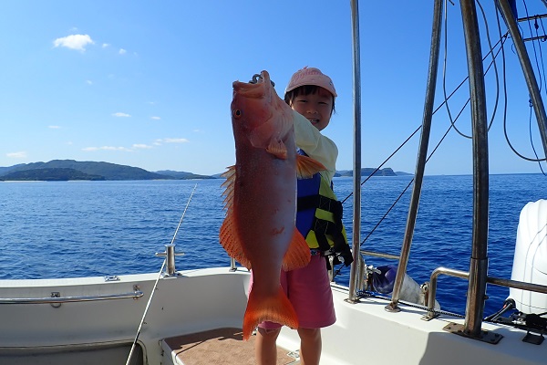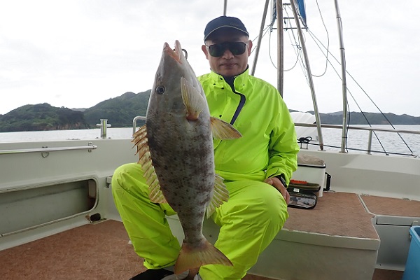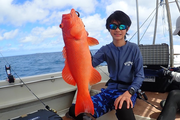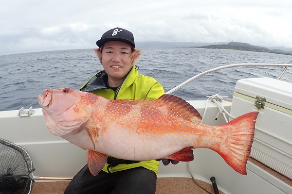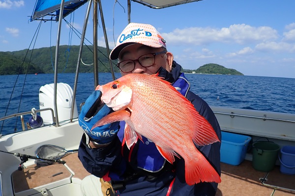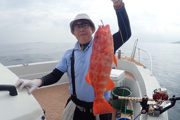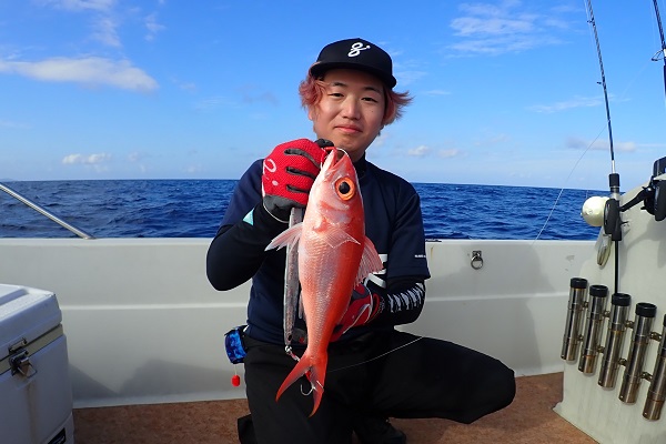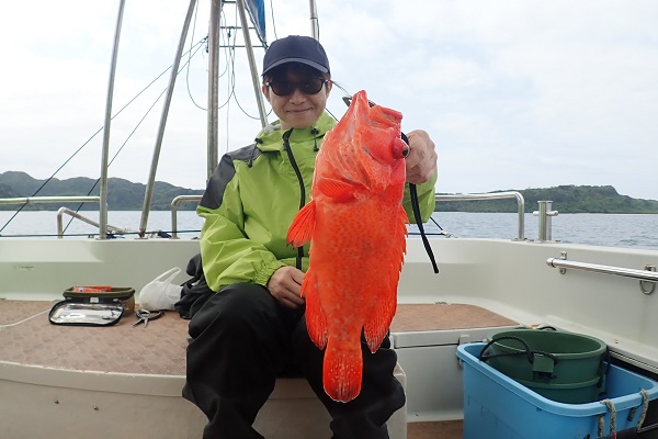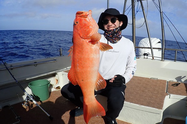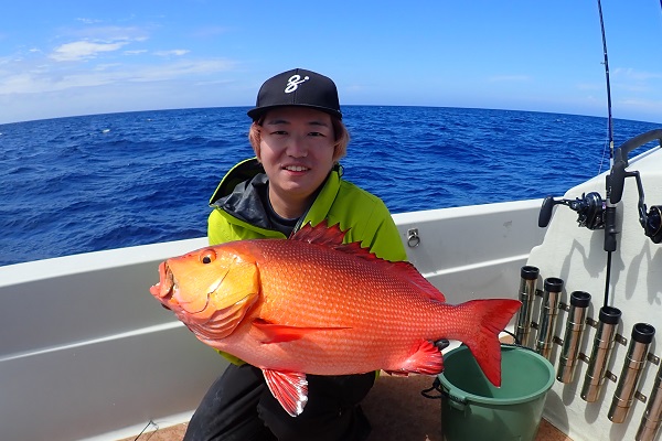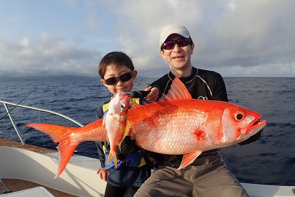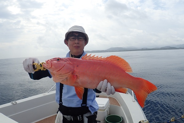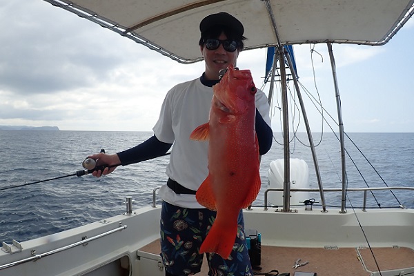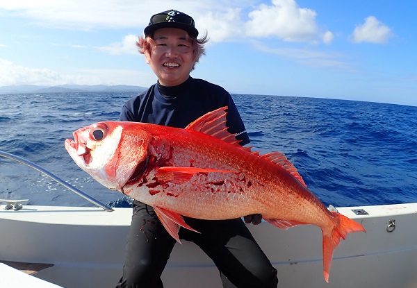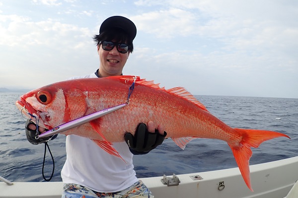| 今日は朝から波1m。風も弱く最高に気持ちの良い海況です。 初めての深海ジギングは水深280mからスタート。ベイト反応も良く、アタリはありましたがフッキングせず1流し目終了。3流し目にて、 出会いたかった赤いデカイ魚。人生最大を更新したみたいで、嬉しいですね!その後は深海ビタローを追加してお昼前には帰港となりました。 是非また今度は数日ゆっくり釣りに来て下さいね。 |