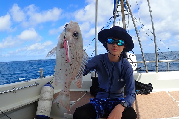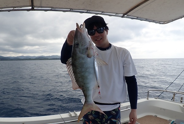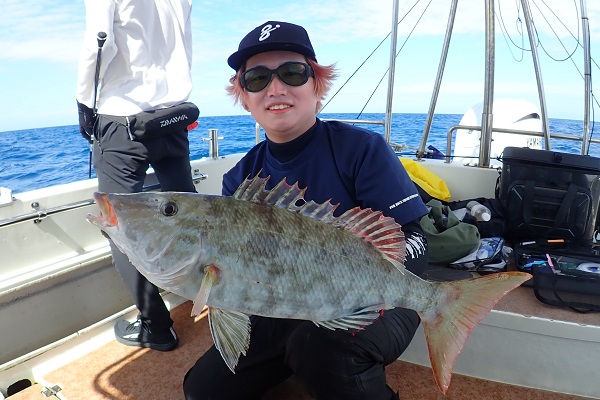 | 今日も南風の波1.5m。今日は早朝出船で深海ジギングへ行って来ました。まずは水深280mからスタートです。 日の出直後の1投目からイソマグロがヒット!5〜6kgの小型ですが、深海イソマグロは見質が違いとっても美味しいです。 その後もアタリは多く、小型のアカマチやギンメダイ、深海ビタロー、そして立派なオオクチハマダイも複数キャッチ!!おめでとうございます。 お昼前には反応が無くなり、水深100〜150mへ移動。 イメージ通りのアクションで気持ち良くヒットしたキツネフエフキ。 グルクンを釣って今日はここまで!明日は朝から泳がせ釣りでーす。 |