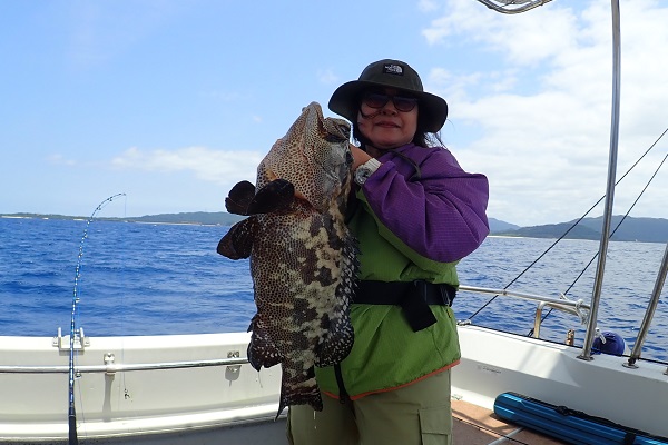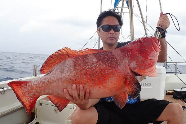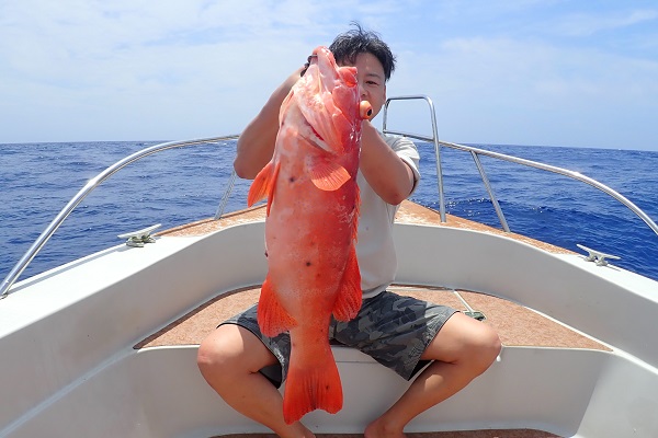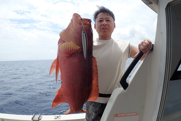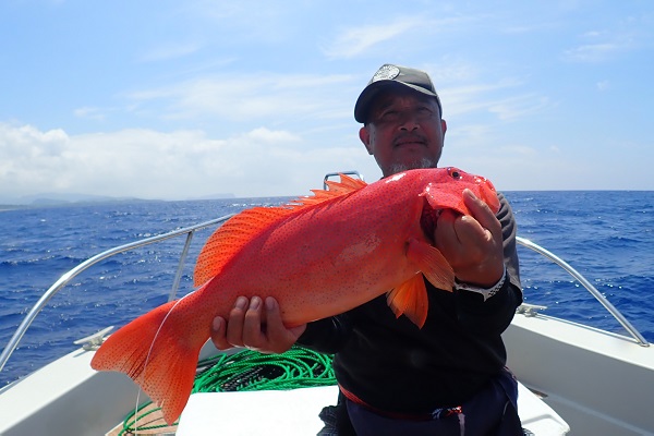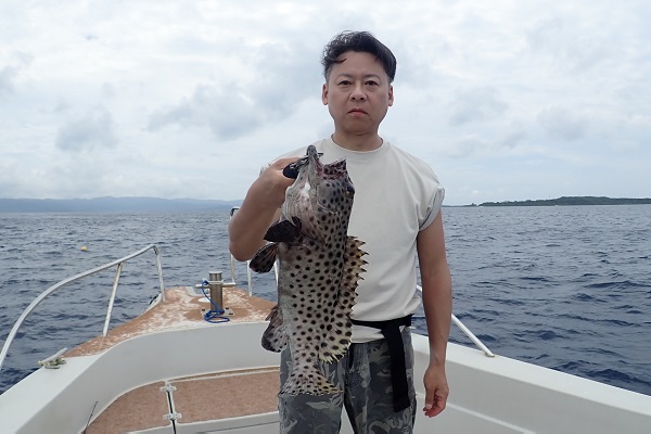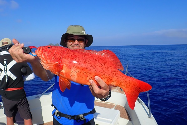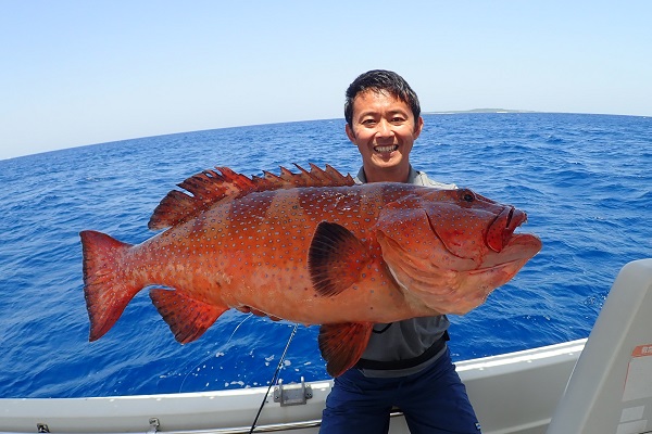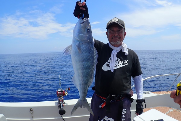 | 毎年2回は遊びに来てくれる常連様。今回はグルクン泳がせ釣りで、アカジンを狙ってきました。 グルクンの活性も悪く、ぽつぽつとしか釣れない日。せっかく針に掛かったグルクンもハタに横取りされてしまいます。横取りしたハタの尾鰭に針が掛かり、グルクン仕掛けでコクハンアラをキャッチ!! その後は沖へ出て泳がせ釣りをして、バイト数回ありましたが残念ながらノーヒット!午後からは潮が緩くなりノーバイト!リベンジしましょう! |