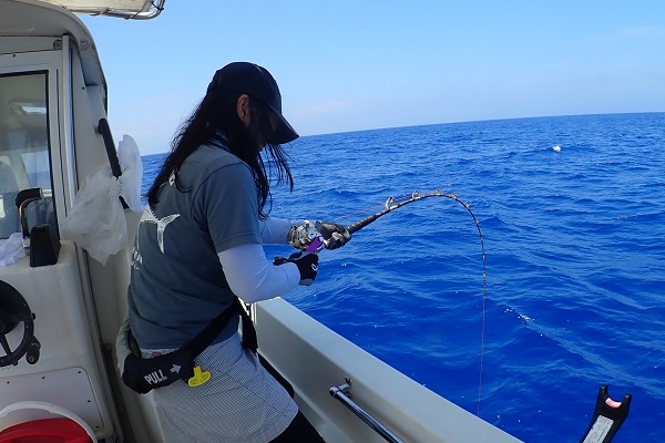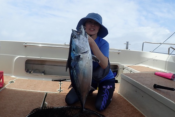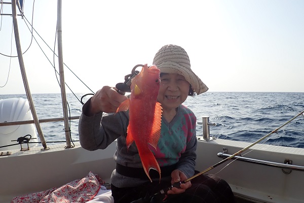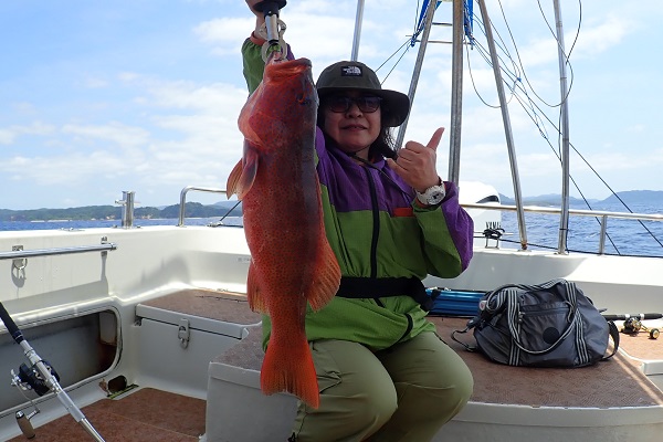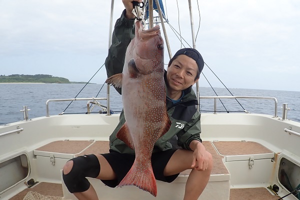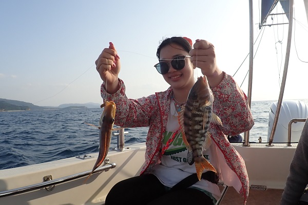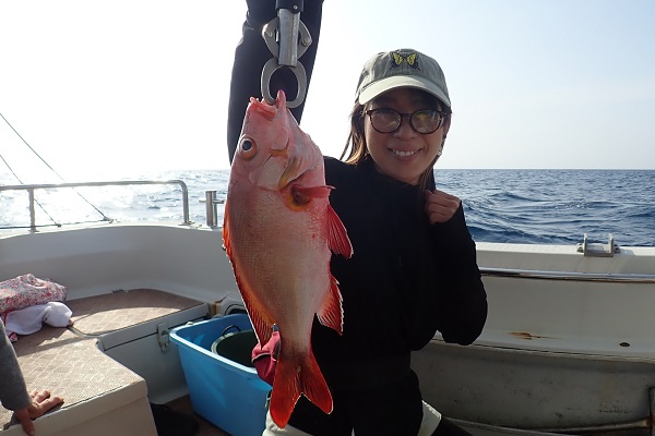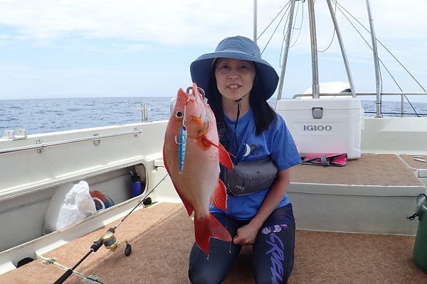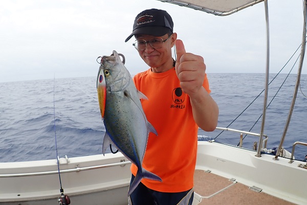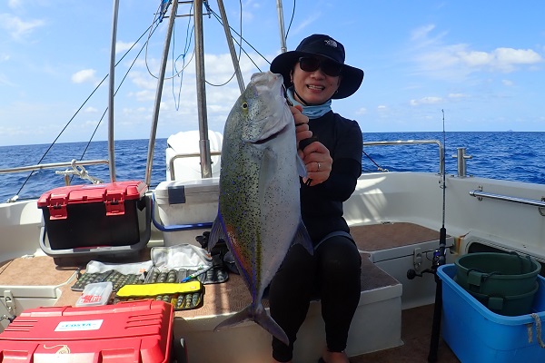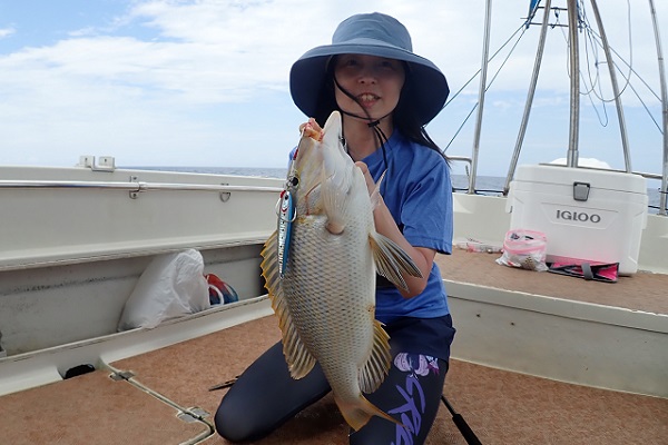 | 今日から波1.5mの海日和です。今日は午前・サンセットとチャーターツアーで出船してきました。 ポイント到着2流し目で良型のミミジャーをキャッチ。その後も、 ミミジャーやアカジンなど美味しい魚をしっかりと釣り上げてくれました。今日は妹さんの独り勝ち!みんなに美味しい魚をご馳走してあげて下さい。 |