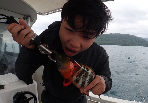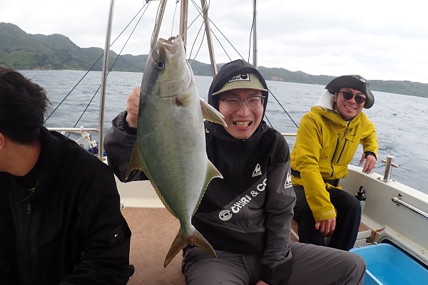 | 昨日は波4mの大時化でツアーは中止。今日から徐々に天候回復でツアー再開です。ターゲットはアカジン!との事でしたが、生憎の海況の為、船浮湾内で餌釣りとジギングで美味しい魚を狙ってきました。 水深30mから釣りスタートしましたが、魚探の反応は凄いのにアタリ少なめな日。ぽろぽろ釣れる魚達を拾い釣りとなりました。 お昼前には深場へ移動してジギング開始。 水深70mの良い反応にはカンパチがついていました!おめでとうございます。その後もポイントの移動を繰り返しましたが、魚の活性が低く、アカジンも次回へお預けとなりました。是非、リベンジ釣行させて下さいね。 |