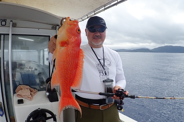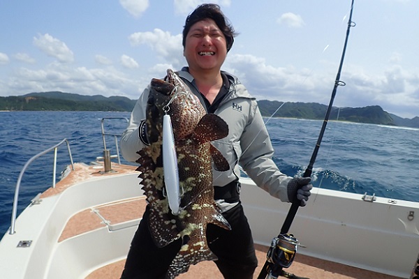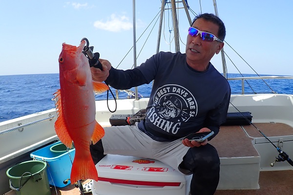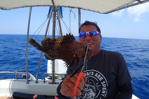 | 今日は波1.5mの海日和です。ゲスト様は石垣島から日帰りということでのんびり出船してライトジギングで根魚を狙ってきました。 魚探に反応はありますが、活性低めな日。食いも浅く、ミスバイトの連続です。そんな中、船長は・・・、 良いサイズのコクハンアラをいただきました。 |