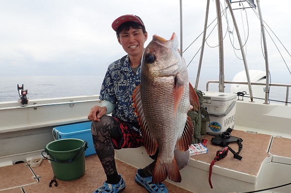 | 今日から2日間、毎年GWに遊びに来る常連夫婦と巨大魚狙い!しかし今日はお昼過ぎから海況が悪くなる予報なので、早朝出船で深海ジギングに行って来ました。 ポイント到着1投目からドラグを出す良いサイズがヒット!上げてみてビックリな巨大オオクチハマダイ!重さはまさかの10kg!!今までも多数のオオクチハマダイを釣ってきましたが、過去最大個体でした。 その後はアタリも無くなり、浅瀬へ移動して泳がせ釣りをしましたが魚の活性ゼロで11時には雨が降り始めて、早上がりとなりました。 |