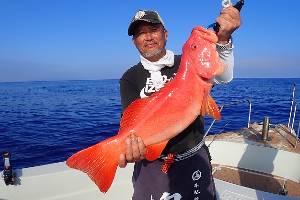 | 今日も波1.5mのベタ凪です!ゲストはJGFAの日本記録を200種類ほど持っている釣り好き様です。今回のターゲットは記録が出されていないエチオピアと浅瀬のフエダイ類です。 記録認定ルールとしては、手巻き・1本針×2本までなどなどありますが、水深500mのエチオピアを手巻きで狙います。1ポイント目は反応ゼロ。 移動をしたポイントの1投目にして4kg前後の個体をキャッチ! その後も深場で釣りをしましたが反応はなく、浅瀬へ移動。 テンヤでフエフキダイ、ハタなどを釣り、最後の最後にヨコシマクロダイをキャッチ!!こちらも記録のない魚だそうで、日本記録認定!?の可能性が高いみたいです。またのお越しをお待ちしております。 |