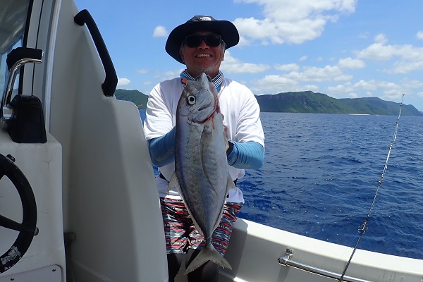 | 昨日の時化も一晩で落ち着き、今日は緩めの北風です。ということで、島の南側 鹿川まで遠征に行き、ジギング・泳がせ釣りをしてきました。 水深120mのポイント到着後、釣りを開始しましたが潮の流れが早く深場を早々に断念。水深40〜60mでは、カスミアジ・アカジン等南国の魚達は活性良し!!その後に事件があり、 またしてもカスミアジ、10kg超えのコクハンアラのダブルヒット!大潮の時合を見事物にしました。天気も良く、とっても気持ちの良い遠征釣りでした。 |
