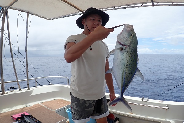 毎年恒例の常連ゲスト様。去年・一昨年とアカジンの美味しさに虜になり、今年も泳がせ釣りでアカジンを狙ってきました。![]() グルクンは順調に釣れ、泳がせ釣り開始。しかし潮の流れが緩く、魚の活性が悪い日。魚群探知機に反応が出るポイントを転々として良型のアオチビキをキャッチ!!最後はサメとファイトして今年の釣りは終了となりました。残念ながら本命は釣れませんでしたが、今年はアオチビキを堪能して下さい。 |