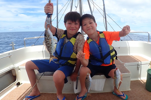 昨日釣ったグルクンを生簀で活かして、今日は朝から泳がせ釣り開始!![]() 潮の流れが緩く、なかなかバイトがありませんでしたが良いサイズのアオチビキをキャッチ!おめでとうございます。その後はサメの猛攻に遭い、ポイント移動の繰り返し。 ![]() いつもより水深が深いポイントでアカジンを釣り上げ、最後は大物ポイントで良いアタリがありましたが、残念ながらラインブレイク。 今年はお兄ちゃんの成長を凄く感じられた2日間でした。来年も楽しみです。逃がした魚達、リベンジしましょうね。 |