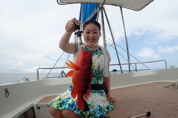 | 台風5号も通り過ぎて穏やかな海に戻るかと思いましたが、今度は台風6号が台湾の西側で発生!その影響なのか、大雨&強風です。 赤い魚がリクエストでしたので、アザハタポイントで見事赤い魚をゲット!その後も、タイラバと餌釣りで、 雨が降っては止んでの繰り返しでしたが美味しいお魚を続々と釣り上げてくれました。 |
