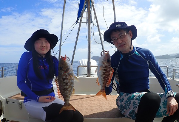 午後は釣り好きお父さん+初めての船釣り娘さん。午前に比べて流れが早く釣りにくい状況でしたが、沖へ出て頑張ってきました。![]() ![]() 初めての船釣りでしたが、魚の活性に助けられて取っても楽しんでもらいました。お父さんはというと、バラハタや良型フエフキダイなど数釣りを堪能していただきました。次回はガチ釣りへ行きたいですね。 |